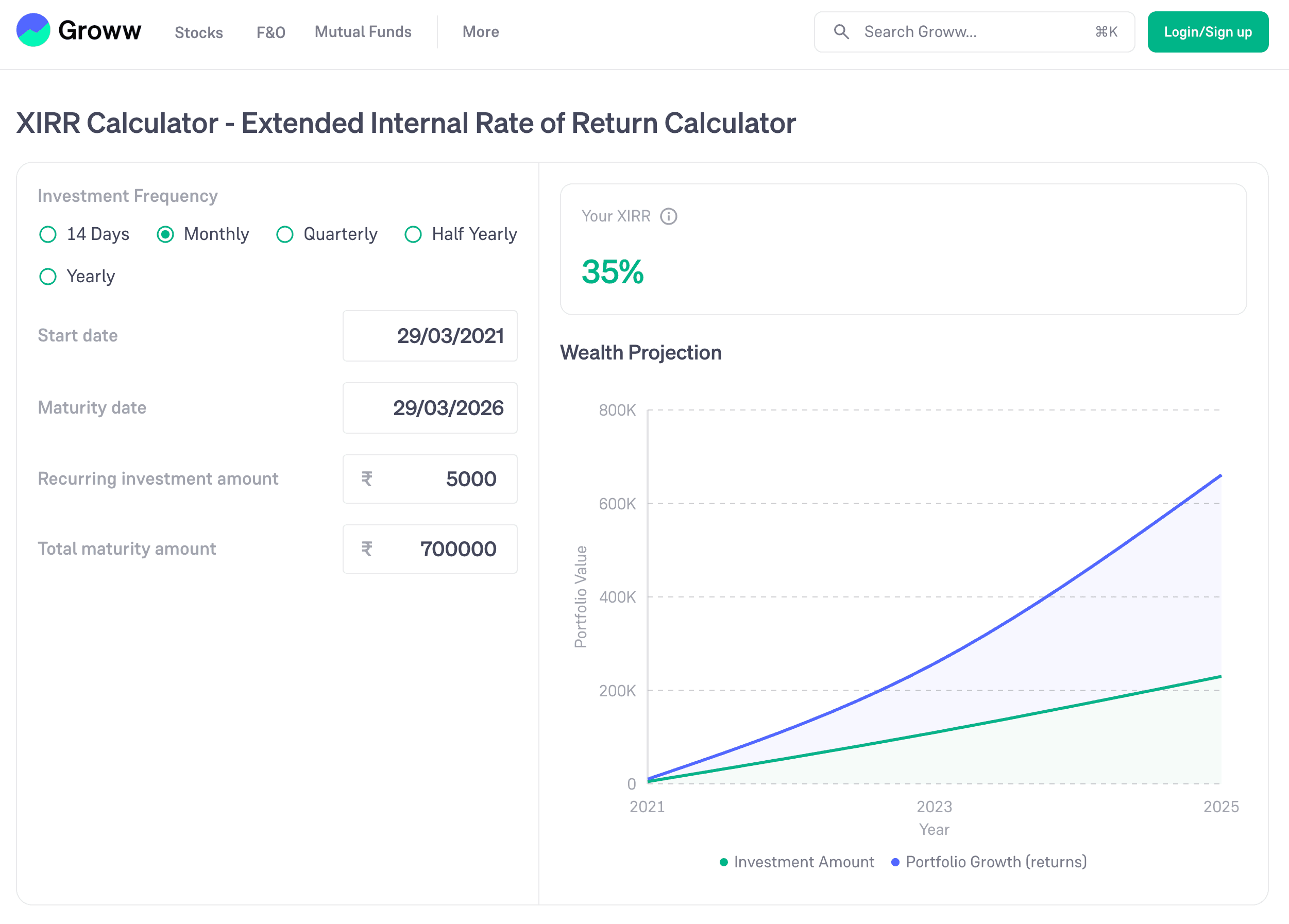 Our calculator’s results were cross-checked against Groww’s XIRR calculator to ensure reliability and trust for the default mutual fund SIP profile. Check this screenshot to see how Groww’s output compares with XIRR results for a 5-year period with a ₹5,000 monthly SIP. Please note that the 34.64% shown by us is correct as per the formula. Groww rounds off the XIRR value to the nearest whole number, hence it shows 35%, whereas we display the exact percentage.